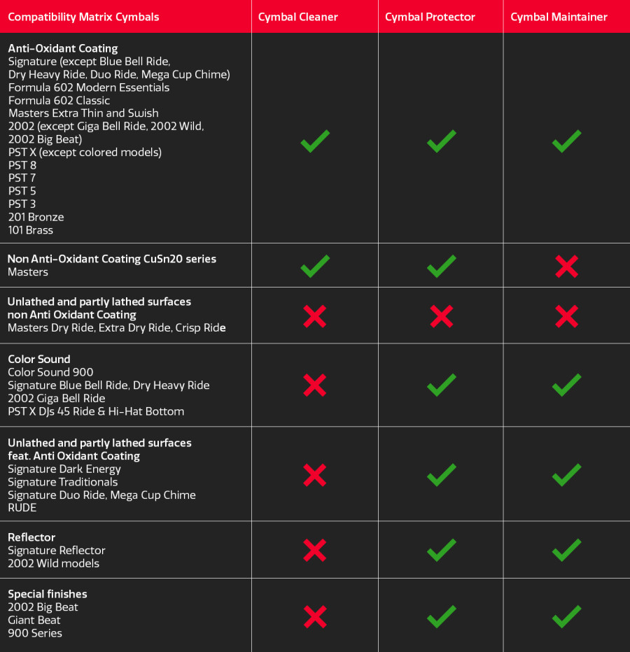 Color Sound – Farbige Cymbals sollten nur mit Cymbal Maintainer und Cymbal Protector gepflegt werden. Die Anwendung von Cymbal Cleaner kann zu Verfärbungen führen.