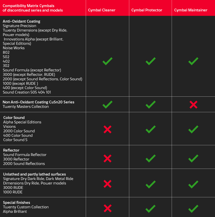 Special finishes – Diese Kategorie fasst verschiedene Oberflächenbehandlungen zusammen, die nicht nur den spezifischen Klang einer Serie oder eines Modells beeinflussen, sondern dieser bzw. diesem eine prägnante Optik verleihen. Sie sollten nur mit Cymbal Maintainer und Cymbal Protector gepflegt werden. Die Anwendung von Cymbal Cleaner kann zu Verfärbungen führen.